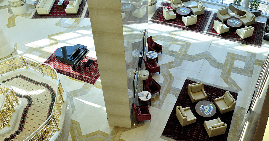 Yyldyz Hotel - one of the best hotels in Turkmenistan. Its apartments are located at the foot of the Kopetdag Mountains and offer the best panoramic views of Ashgabat. In Turkmen, "Ýyldyz" translates to "Star" and can be seen from almost any part of Ashgabat. The polished rooms are equipped with Wi-Fi access, a flat-screen TV and marble en suite bathroom, as well as a mini refrigerator, floor-to-ceiling windows and tea/coffee making facilities. The suite features a separate living room and whirlpool bathtub. The upgraded suite adds a dining room and a kitchenette. Breakfast is free, and parking is also free. Other facilities include 3 restaurants, 4 bars and 2 indoor and outdoor swimming pools, as well as a spa, hammam and tennis and volleyball courts