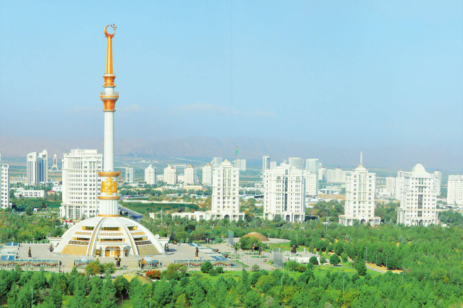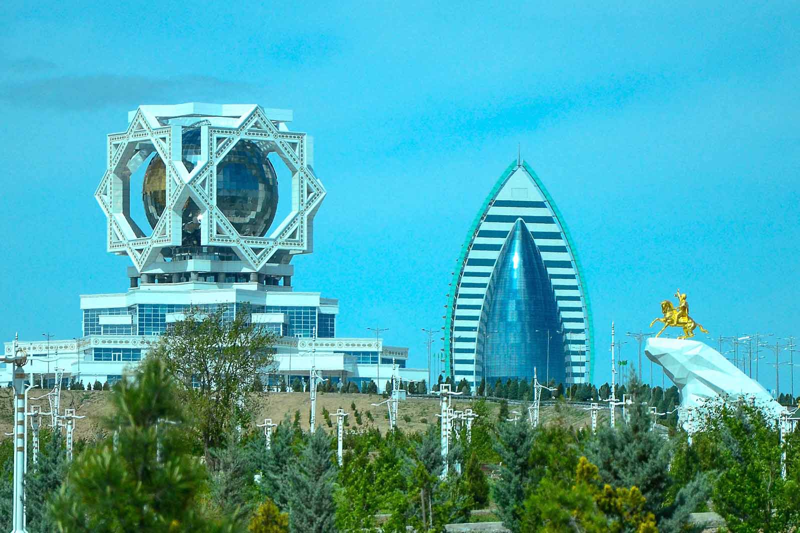 - A panoramic view of Ashgabat's unique architecture imbued with Turkmen cultural symbols